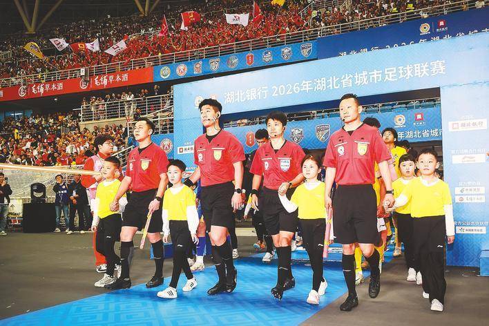 裁判员运动员和小球童一起步入揭幕战赛场。(湖北日报全媒记者 李溪 时龚 通讯员 胡靖 摄)