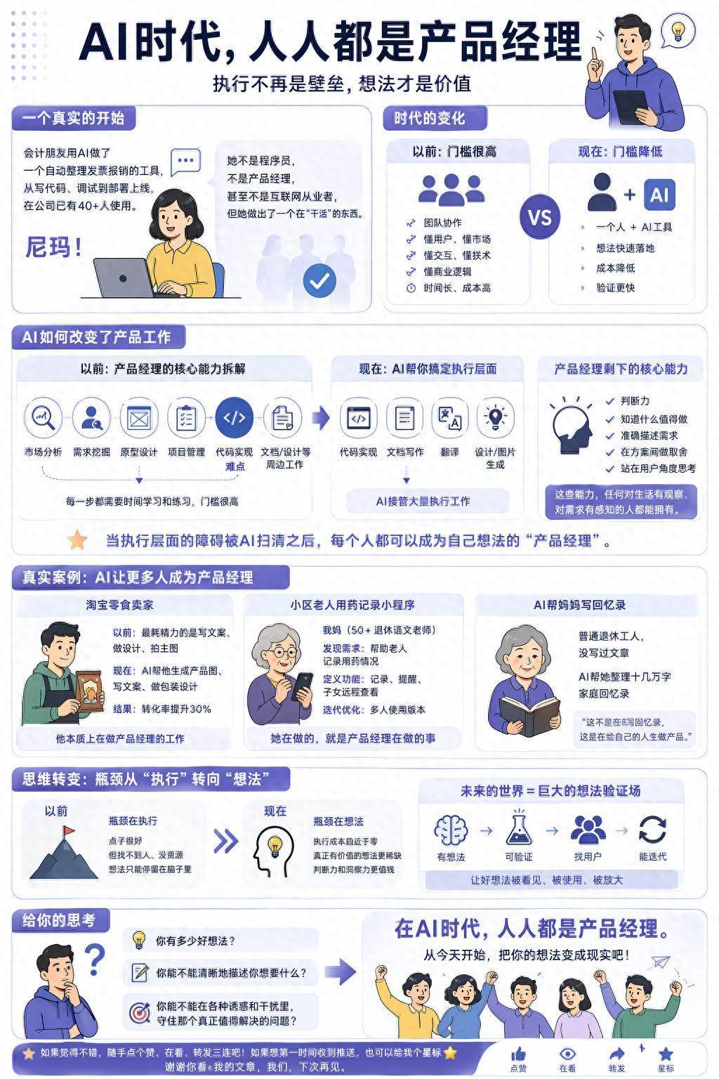 我不是在说AI让一切变得完美,也不是在说产品经理这个岗位会消失。恰恰相反,我觉得产品经理这个岗位会变得更重要,因为AI可以执行,但判断还得人来。